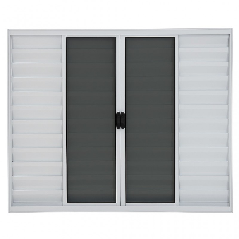A Janela Veneziana de Alumínio possui 6 folhas (4 móveis e 2 fixas), sem grade de proteção, na cor branco e com vidros fumê.