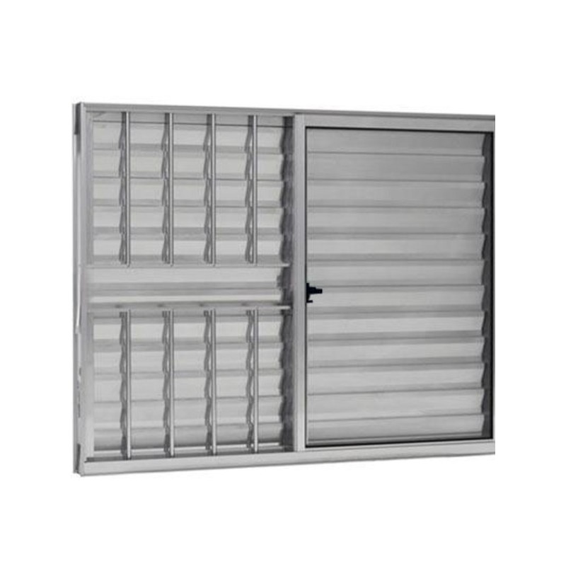 A Janela Veneziana de Alumínio possui 3 folhas (2 móveis e 1 fixa), acompanhada de grade de proteção, medindo 1,00m x 1,00m, na cor brilhante.