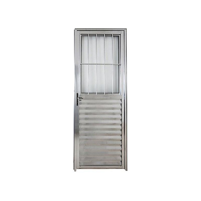 A Porta Social de Alumínio, na cor brilhante, mede 2,10m x 0,90m e possui abertura para o lado direito.